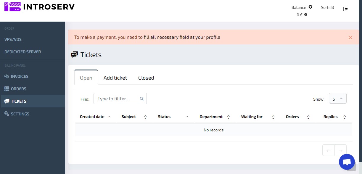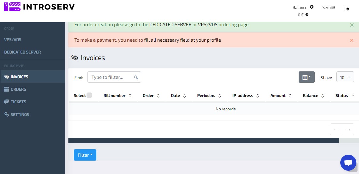 To pay for services, you need to fund your account balance. Payment options are available in the "Invoices" section. To make a payment, you need to complete all required fields in your profile. You cannot pay for services until you have completed the necessary information in your settings.
