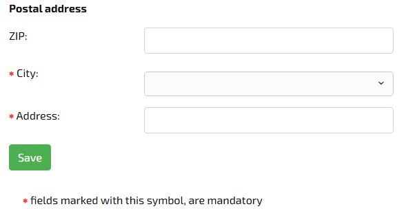 Description: Fields for entering the user's physical address. Completion of these fields is mandatory to enable payment processing. To save the settings entered, click the "Save" button at the bottom of the page.