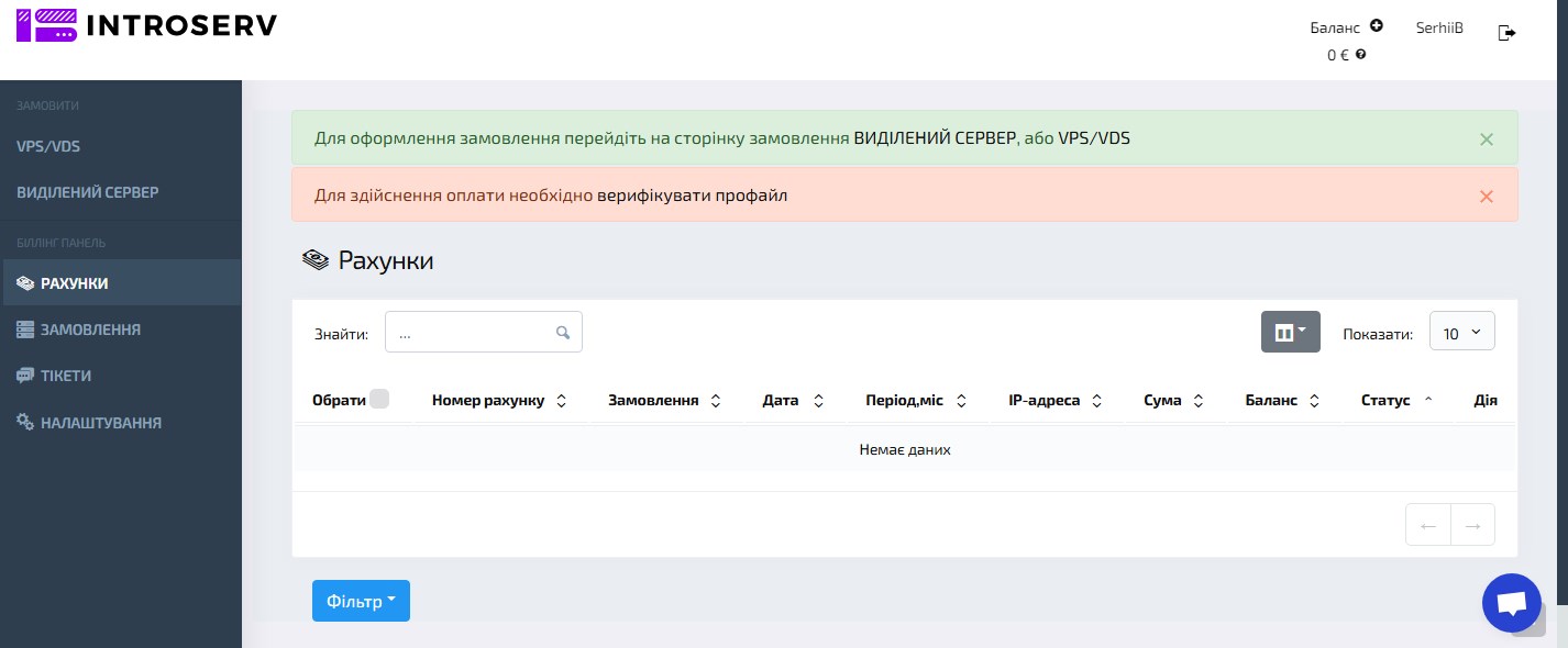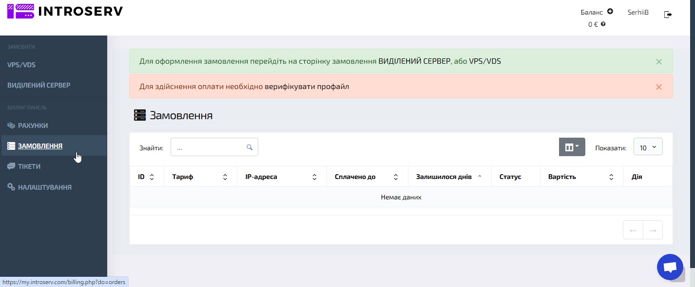 Особистий кабінет Introserv (меню billing) надає користувачам зручний інструмент для керування своїми послугами. Тут ви можете відстежувати статус замовлень, оплачувати рахунки, змінювати налаштування та отримувати доступ до додаткових сервісів.
