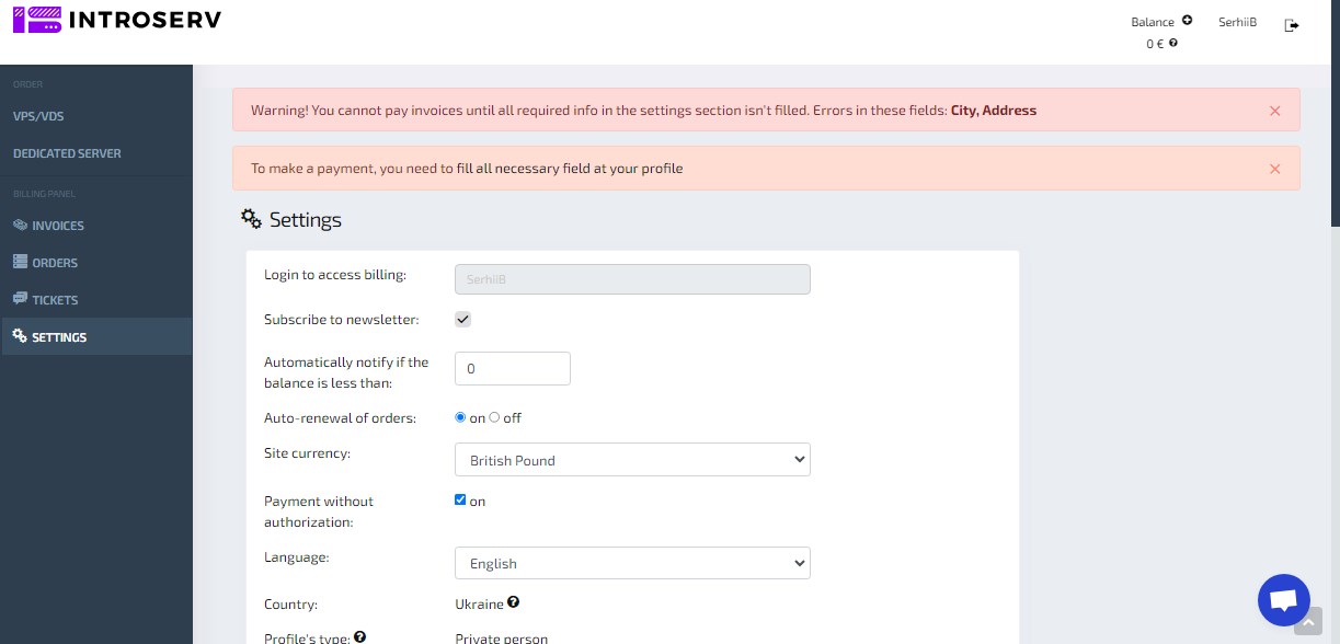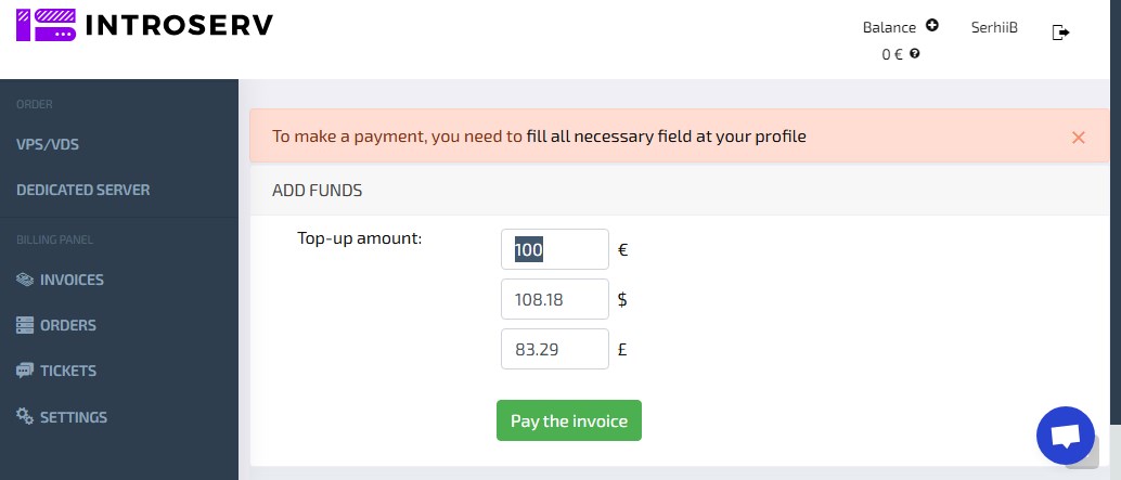 To pay for services, you need to fund your account balance. Payment options are available in the "Invoices" section. To make a payment, you need to complete all required fields in your profile. You cannot pay for services until you have completed the necessary information in your settings.
